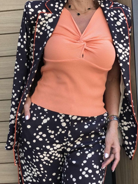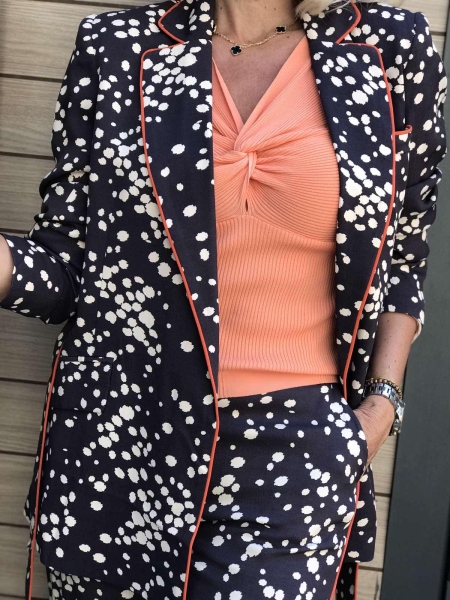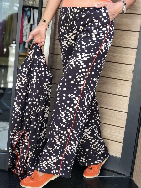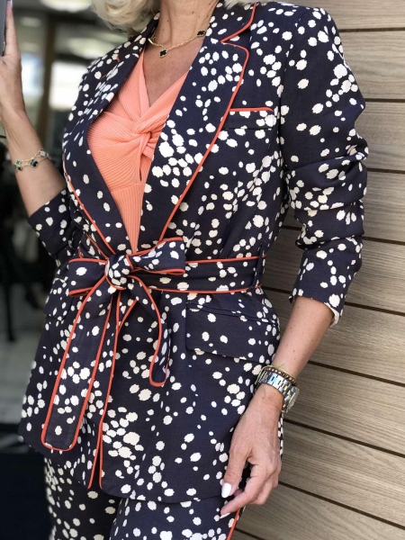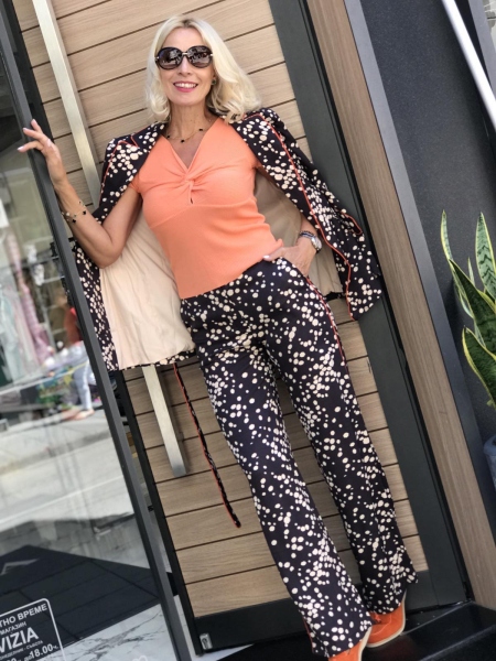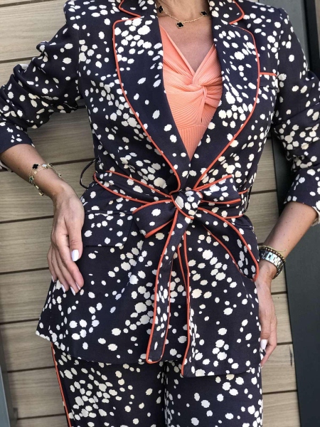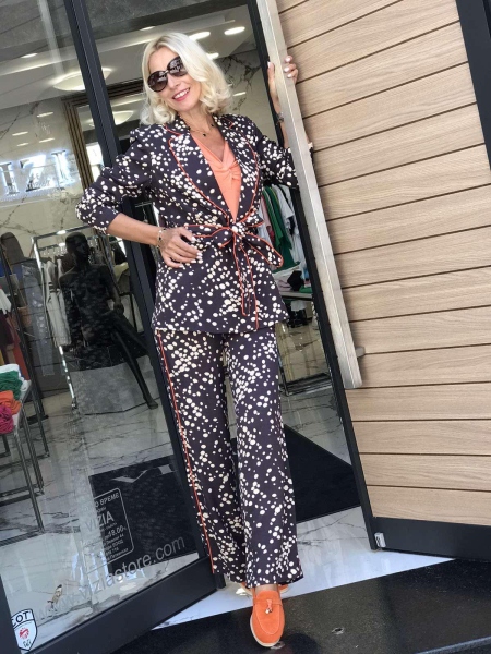 Комплект сако с панталон в тъмно кафяво на точки. Горната част е сако без закопчаване. Към него има колан за втален силует. Панталонът е с фиксирана талия и свободни крачоли.