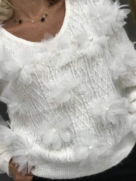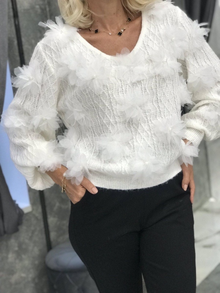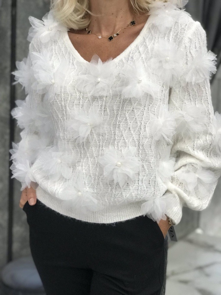 Пуловер със свободен силует и остро деколте. Моделът е универсален размер и е подходящ за S,M.