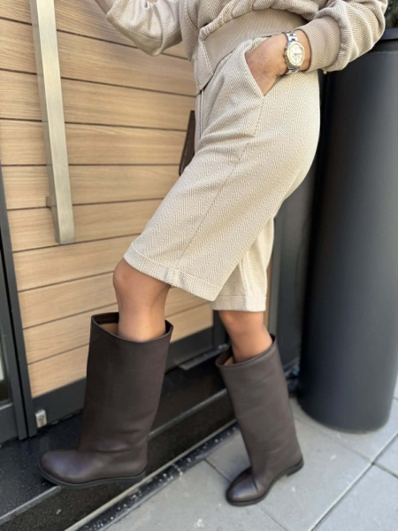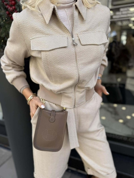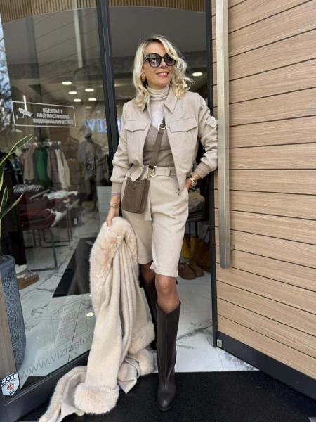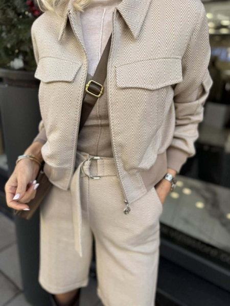 Комплект якенце и къси панталони в бежово райе. Якето завършва с ластик и се закопчава с цип. Късите панталони са с прав крачоли и имат ластик на талията.