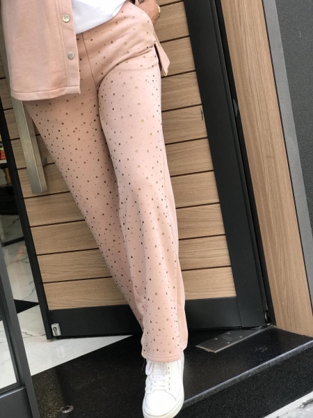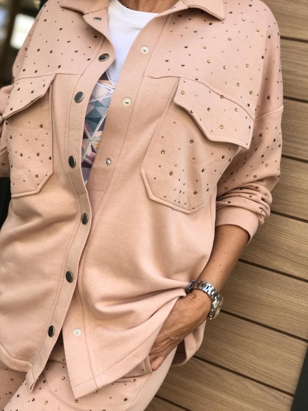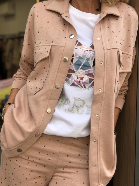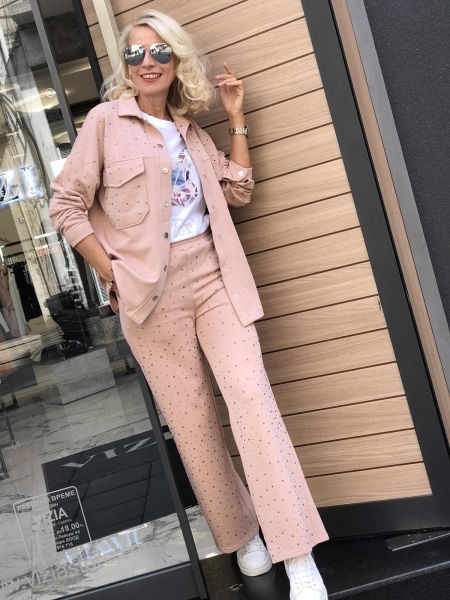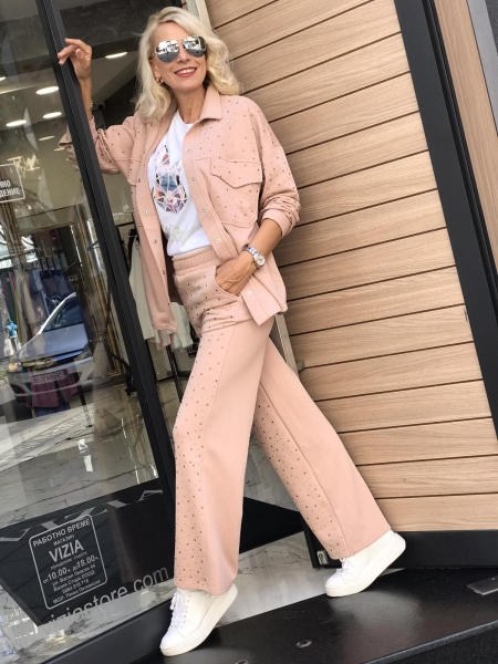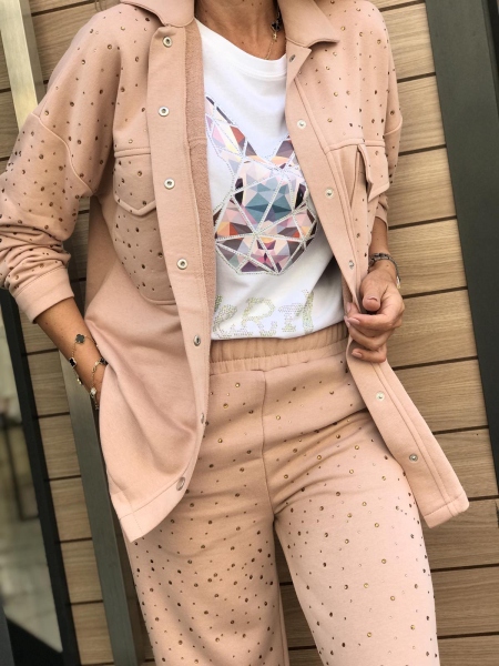 Комплект риза с панталон от трикотажна материя. Ризата е съ свободен силует и може да се носи и като връхна дреха. Панталонът е с ластик в талията и свободни крачоли.