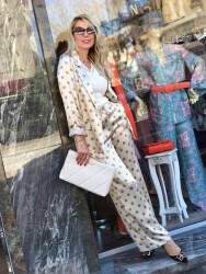 Костюм сако и панталон в черен цвят от трико. Сакото е с напълно свободен силует и се закопчава с две копчета. Панталонът е с широки крачоли и ластик в талията.