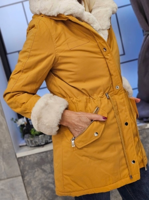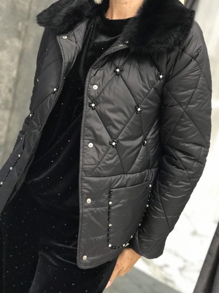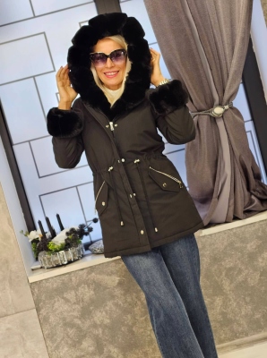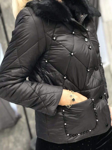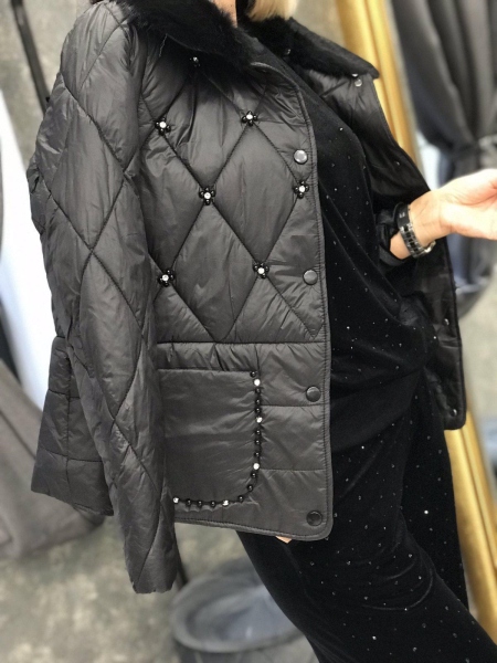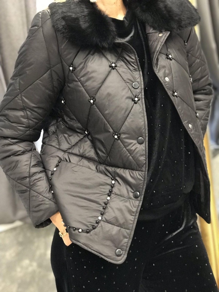 Яке в черен цвят от шушлякова материя. Моделът се закопчава с копчета. Яката е от естествен пух и може да се зваля.