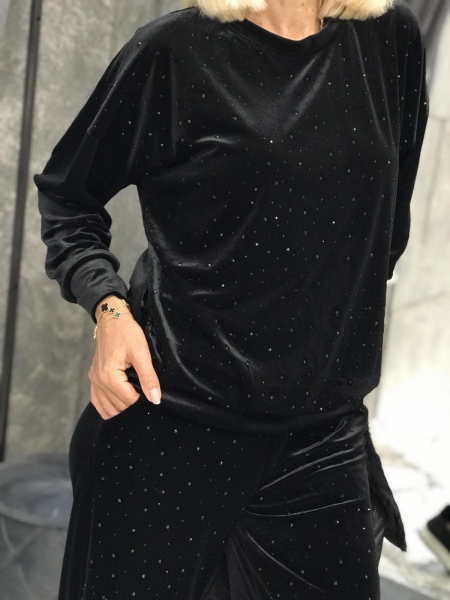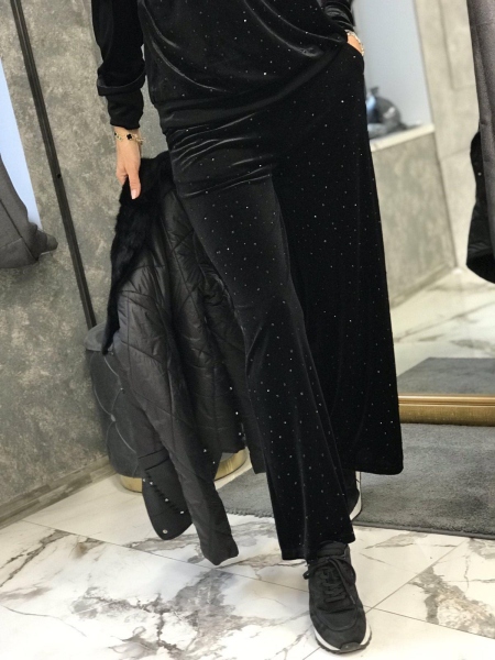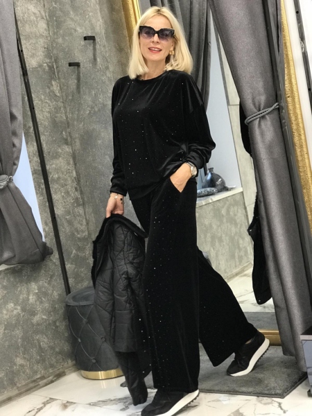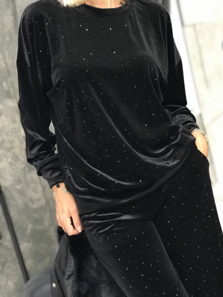Комплект от блуза и панталон в черен плюш. Блузата е с напълно свободен силует и завършва с ластик. Панталонът е с широки крачоли и ластик в талията.