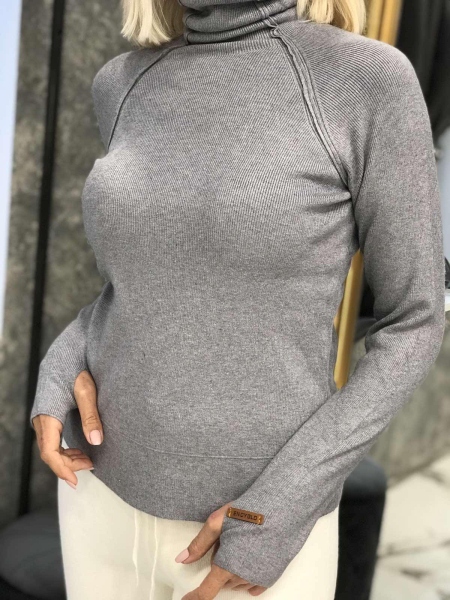 Поло блуза в сив цвят от мека кашмирена материя. Моделът е с дълъг ръкав и има отвор за палеца.