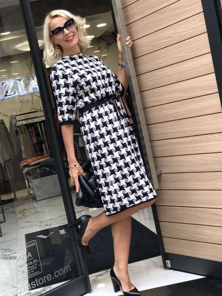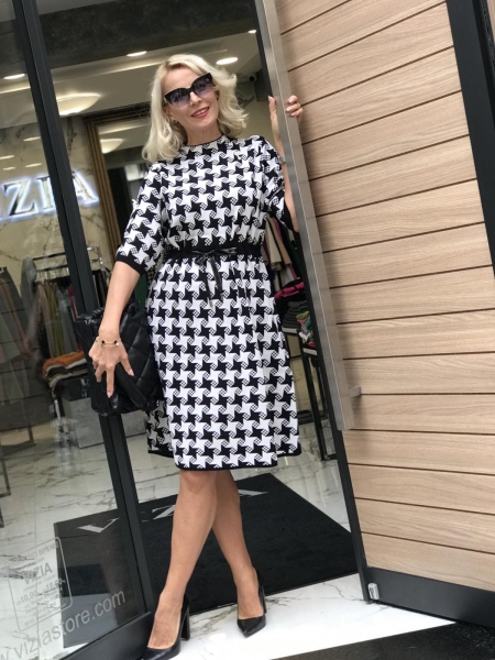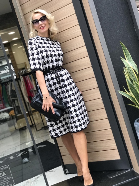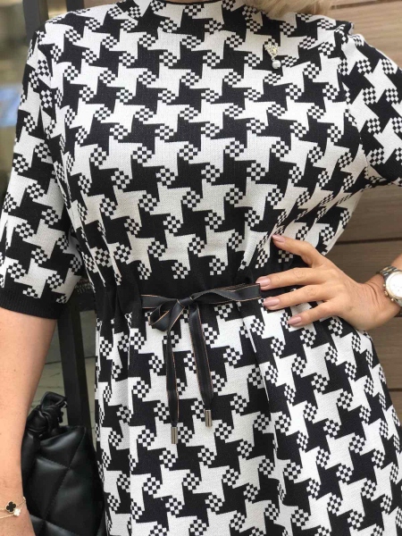 Рокля от фино плетиво в елегантен пепит. Моделът е със свободен силует и има връзки на талията за вталяване. Размерът е универсален и е подходящ за S, M, L.