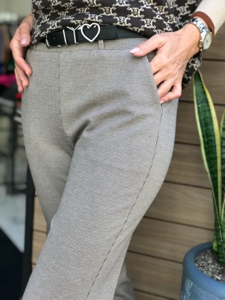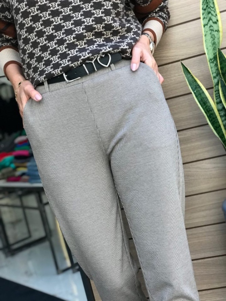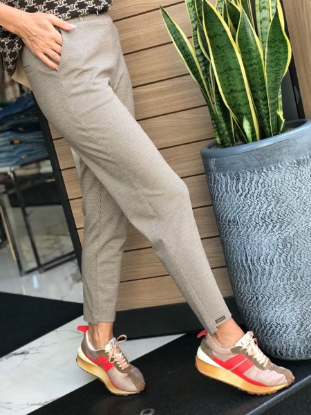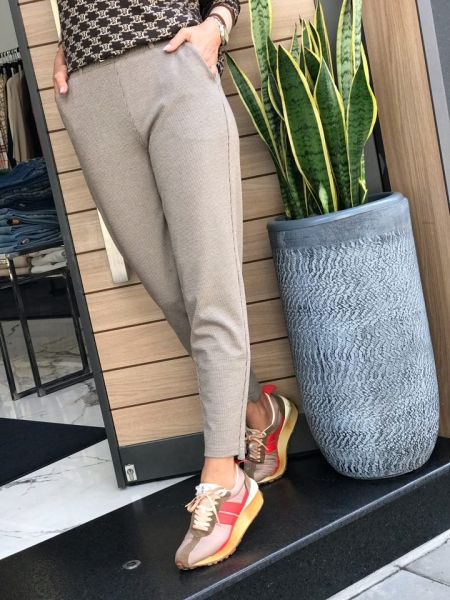 Спортно- елегантен панталон с ластик на талията. Моделът е със стесняващи се крачоли. Към него има и колан.