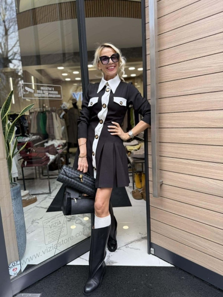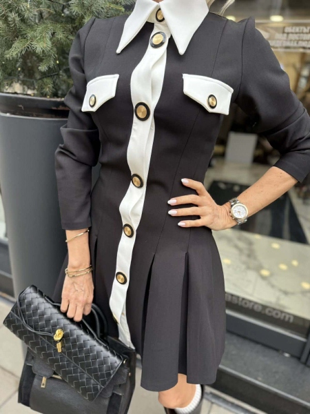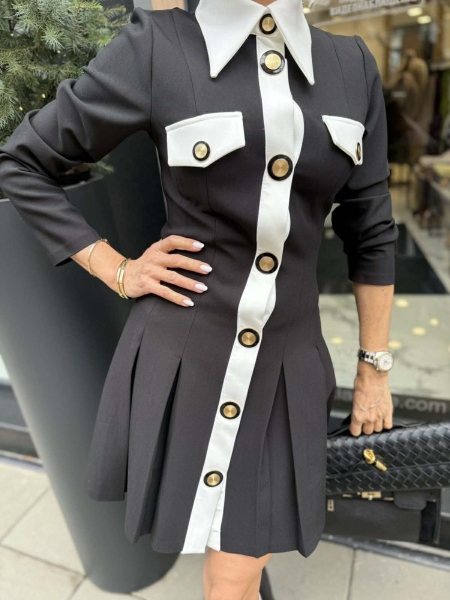 Къса рокля с втален силует от плътна материя. Моделът се закопчава само с копчета.