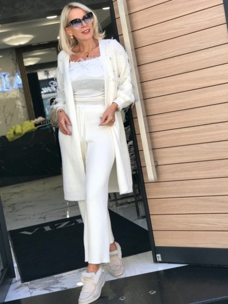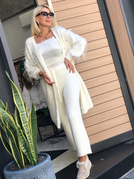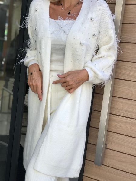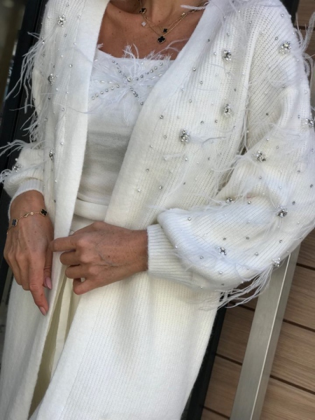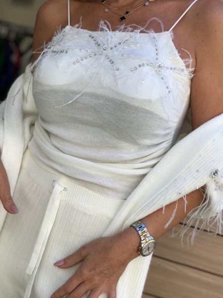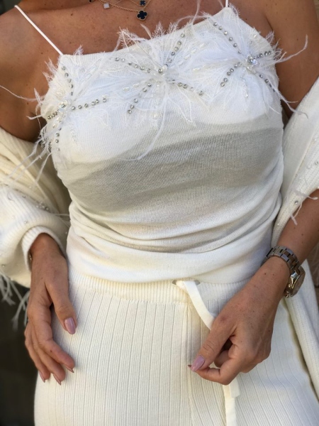 Комплект от фино плетиво декориран с камъни и пера. Топът има подплънки и е с втален силует. Жилетката е с напълно свободен силует без закопчаване. Размерът е универсален и е подходящ за S, M.