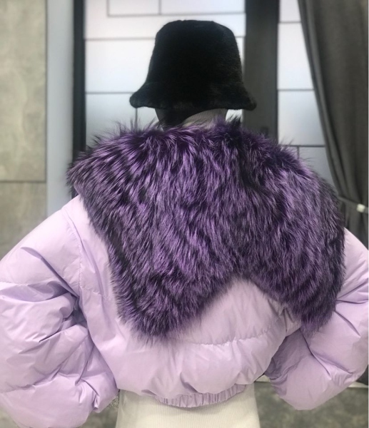 Късо яке от шушлякова материя със свободен силует. Моделът е декориран с яка от естествен косъм. С пълнеж от гъши пух. Размерът е универсален и е подходящ за M, L.