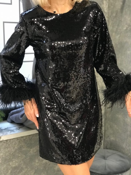 Къса рокля със свободен силует с пайети и пера. Моделът се закопчава с цип.