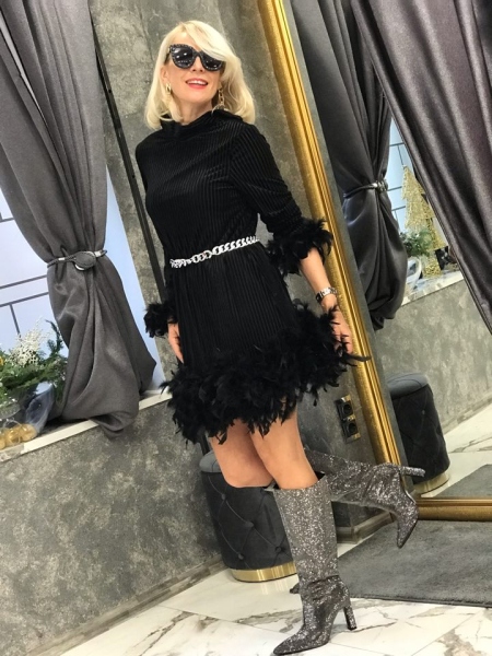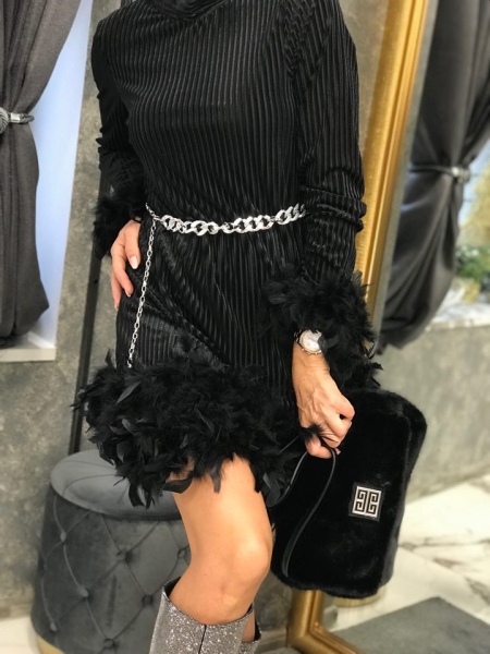 Свободна рокля в черно рипсено кадифе декорирана с пера. Моделът се закопчава с цип.
