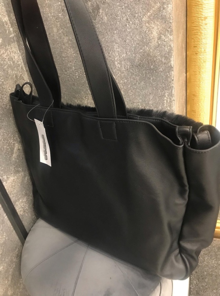 Голяма чанта от еко кожа декорирана в предната част с еко пух. Моделът има една голяма преграда и се закопчава с копче. Моделът има само къси дръжки.