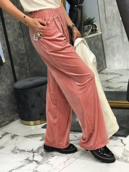 Панталон в розова пудра от кадифена материя. Моделът е с широки крачоли и ластик в талията.
