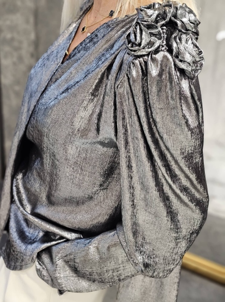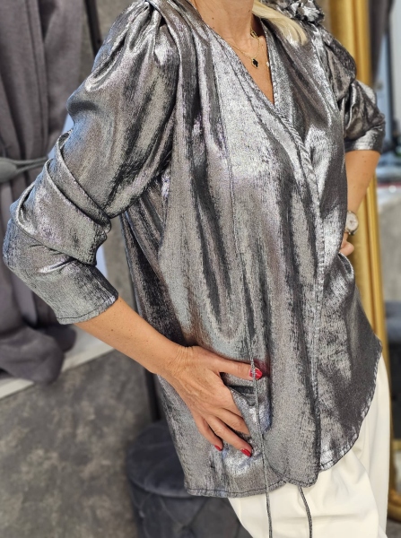 Риза от фина материя в сребрист цвят. Моделът е със свободен силует. Закопчава се с копче на бюста и се завързва с връзки на талията. Размерът е универсален и е подходящ за M, L, XL.