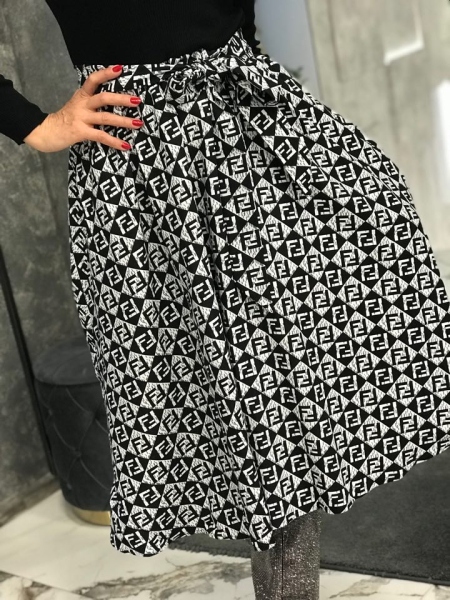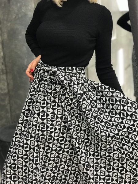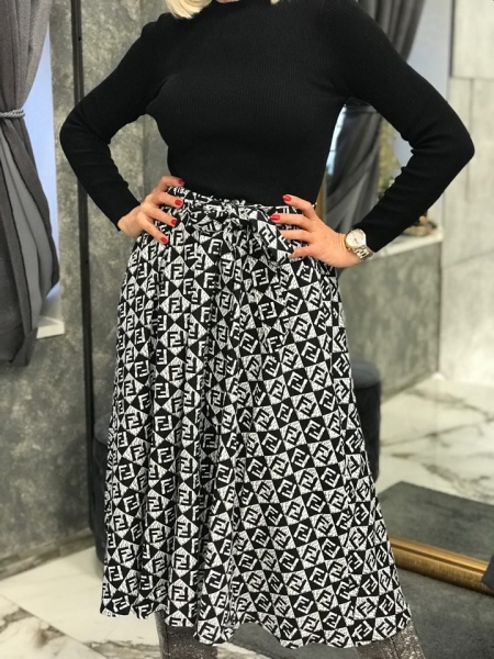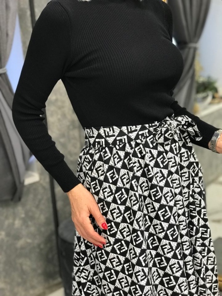 Рокля с вталена горна част и разкроена пола. Горната част е фино плетиво, полата е от плат. Облича се без закопчаване.