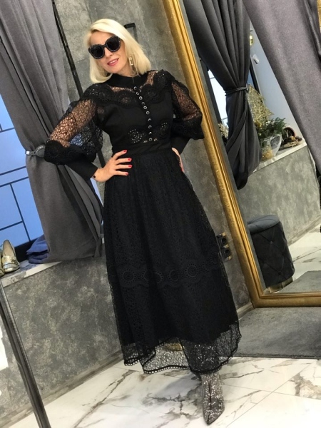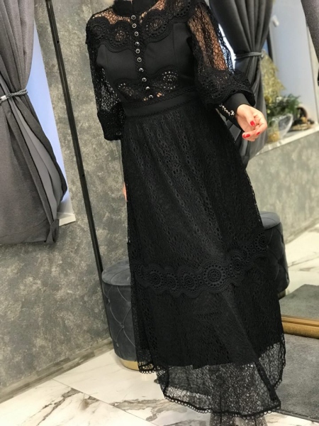 Дълга рокля с втален силует от едра дантела. Моделът се закопчава с цип. Има и подплата.