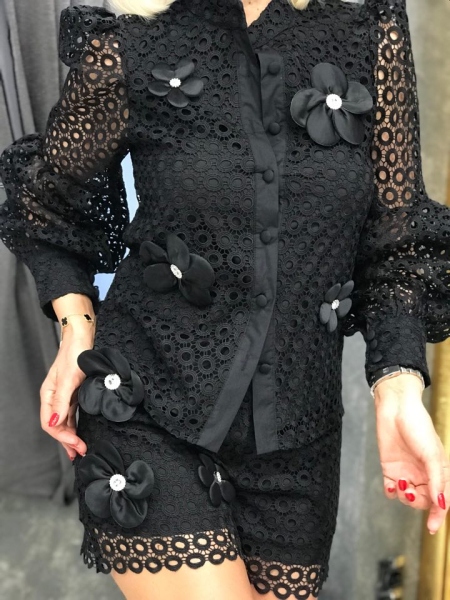 Комплект риза с къси панталони в черно. Ризата е с прав силует тип сако. Късите панталони се закопчават с цип и копче.