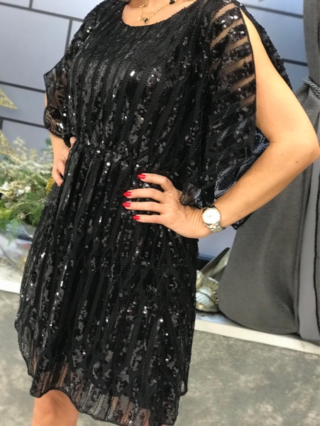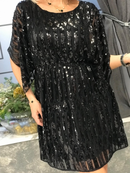 Къса рокля изцяло декорирана с пайети. Моделът има ластик в талията и се обличат без закопчаване. Размерът е универсален и е подходящ за S, M, L.