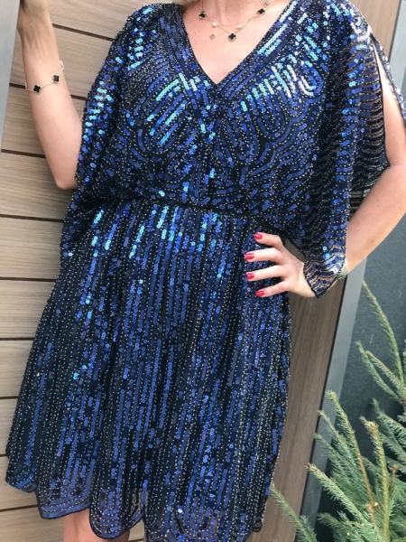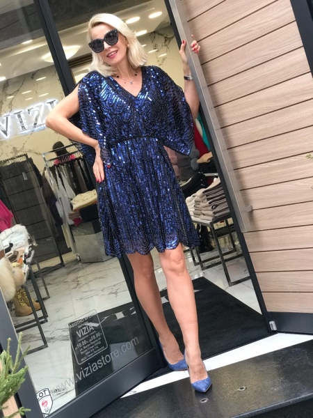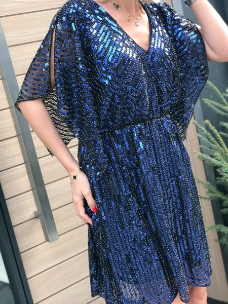 Къса рокля изцяло декорирана с пайети. Моделът има ластик в талията и се обличат без закопчаване. Размерът е универсален и е подходящ за S, M, L.