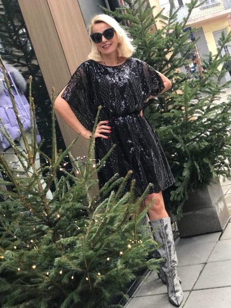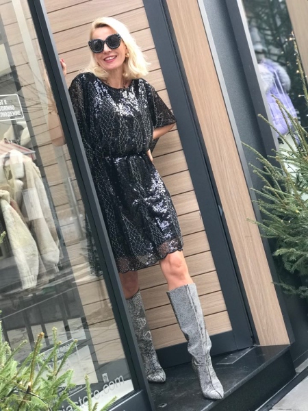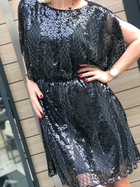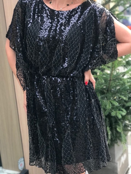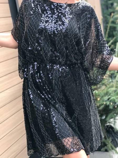 Къса рокля изцяло декорирана с пайети. Моделът има ластик в талията и се обличат без закопчаване. Размерът е универсален и е подходящ за S, M, L.