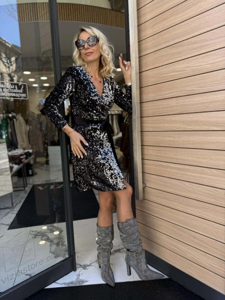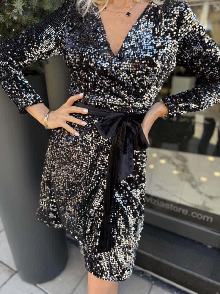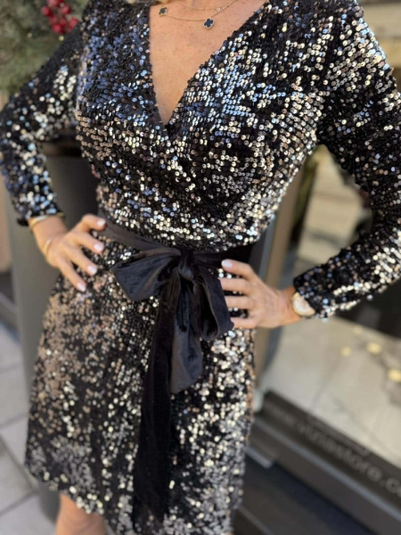 Къса рокля декорирана изцяло с черни пайети с шев на талията и с прехвърлено деколте. Моделът се закопчава с цип. Към роклята има и кадифен колан.