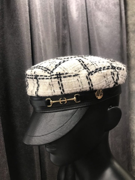 Шапка от букле в бяло с козирка. Има възможност за регулиране на размерът от вътрешната страна.