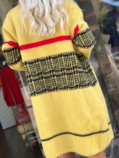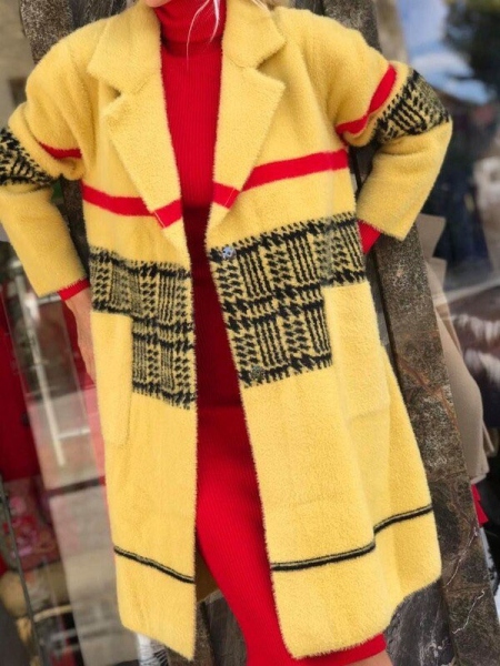 Жилетка в кафяв цвят с карирани елементи.Модела е със свободен силует,закопчава се с едно копче и има яка.Размера е универсален и е подходящ за M,L,XL.