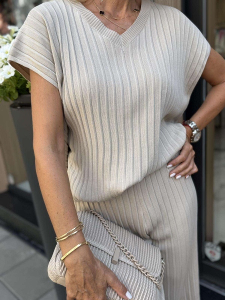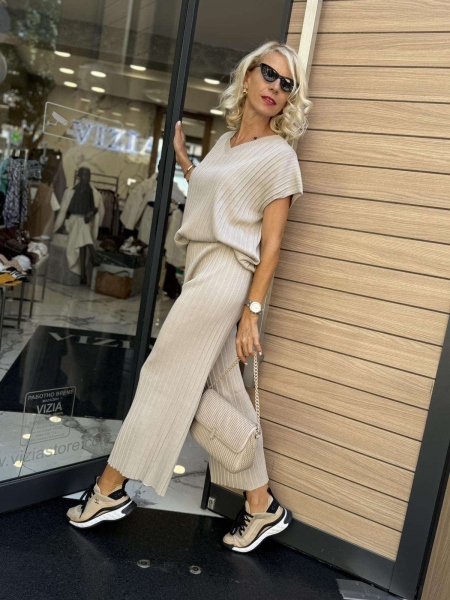 Комплект фино плетиво в бежов цвят. Блузата е със свободен силует. Панталонът е с широки крачоли и ластик на талията. Размерът е универсален и е подходящ за S, M.