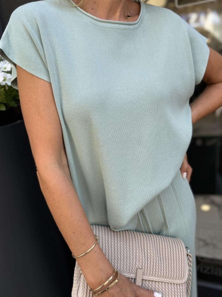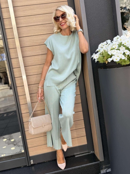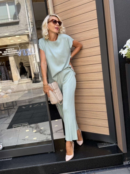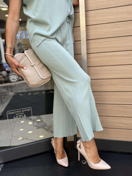 Комплект фино плетиво в цвят мента. Блузата е със свободен силует. Панталонът е с широки крачоли и ластик на талията. Размерът е универсален и е подходящ за S, M.