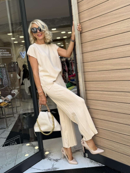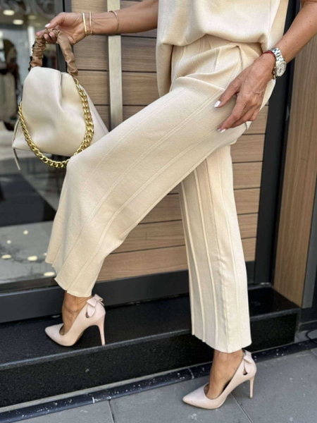 Комплект фино плетиво в цвят екрю. Блузата е със свободен силует. Панталонът е с широки крачоли и ластик на талията. Размерът е универсален и е подходящ за S, M.