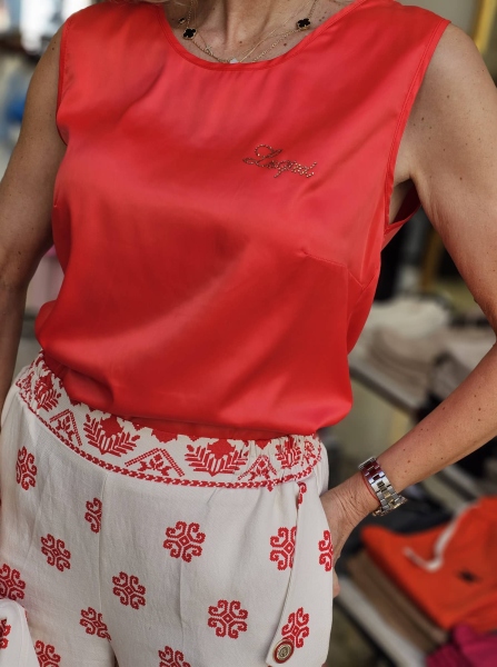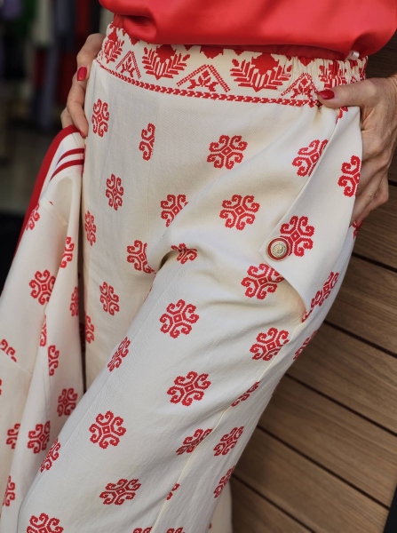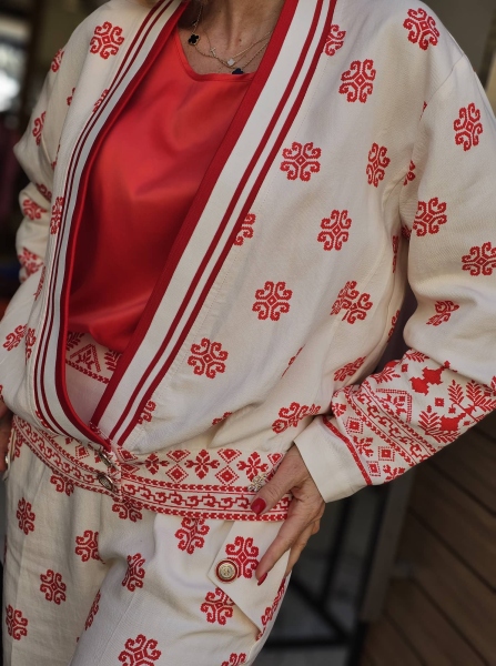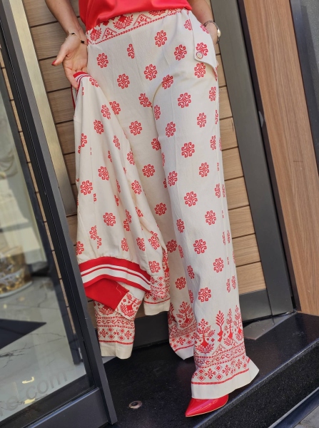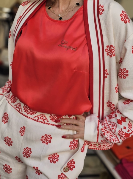 Комплект от три части в бежово и червено. Горната част е яке със свободен силует. Топът е от сатенирана материя. Панталонът е със широки крачоли с ластик на талията.