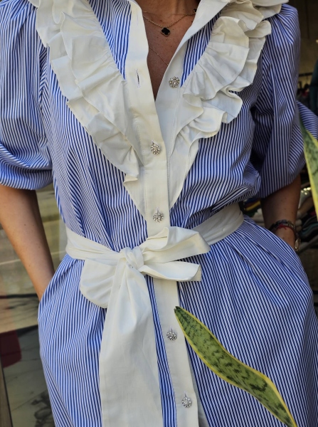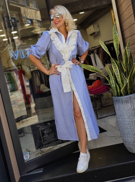 Рокля риза с прав силует с широки ръкави завършващи с ластици. Закопчава се с копчета. Има колан към нея за втален силует.