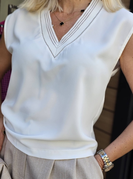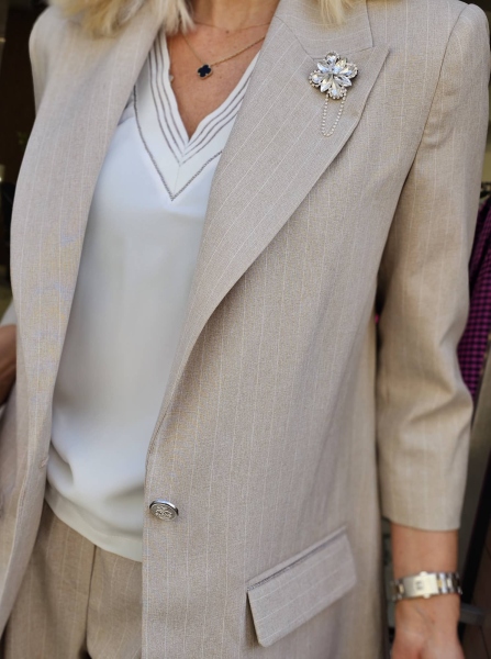 Комплект от три части в бежов цвят. Сакото е с напълно свободен силует и има декорация брошка на реверът. Блузата е от фина материя със свободна кройка. Панталонът е със стесняващи се крачоли и има басти.