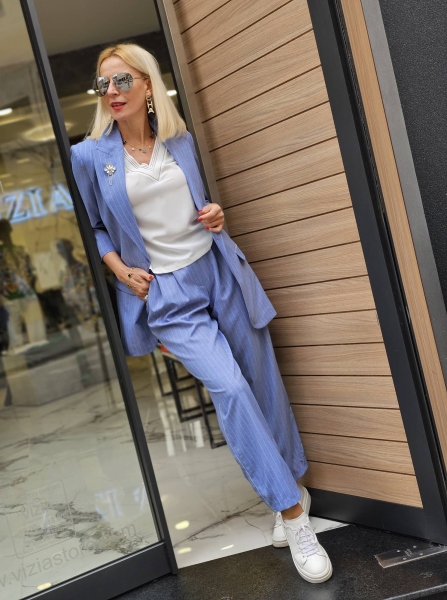 Комплект от три части в син цвят. Сакото е с напълно свободен силует и има декорация брошка на реверът. Блузата е от фина материя със свободна кройка. Панталонът е със стесняващи се крачоли и има басти.