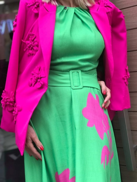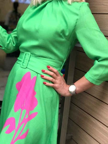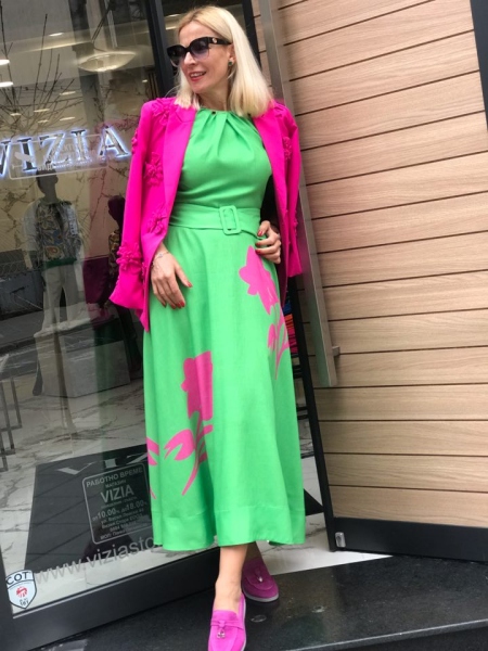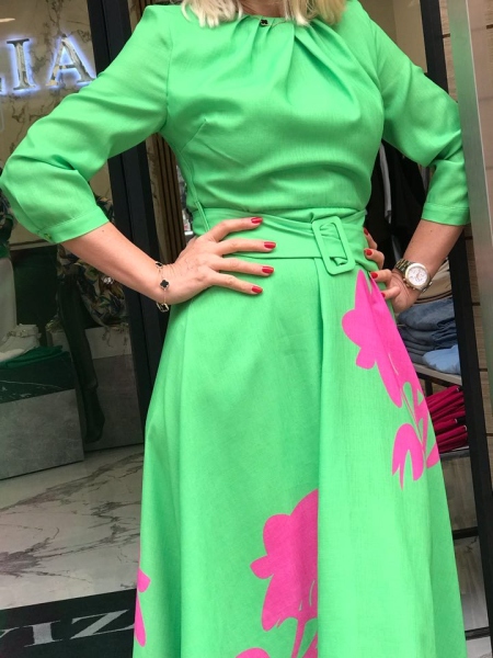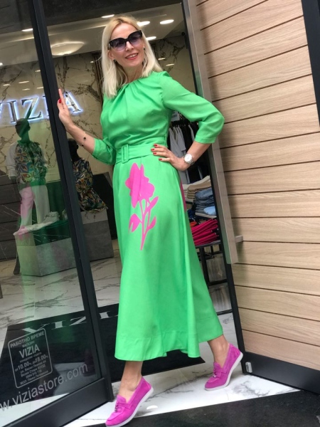Дълга рокля в зелен цвят от материя наподобяваща на лен. Моделът е с шев на талията и се закопчава с цип. Към нея има и текстилен колан.