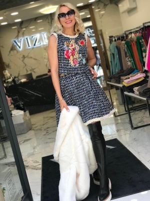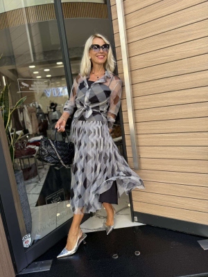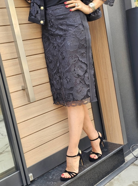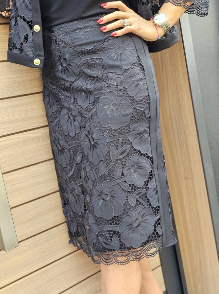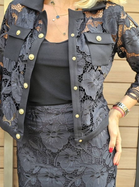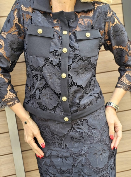 Комплект от едра черна дантела в три части. Сакото е с права кройка, 3/4 ръкави и се закопчава с копчета. Към него има и топ с втален силует. Полата е тип молив с висока талия и се закопчава с цип.