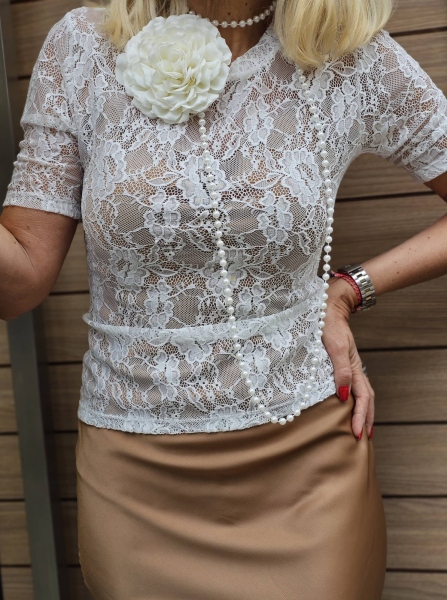 Сатенена рокля с миди дължина в комплект с дантелена блуза с къс ръкав. Роклята е по тялото с тънки презрамки и гръцко деколте. Към нея има и аксесоар перлено колие с цвете.