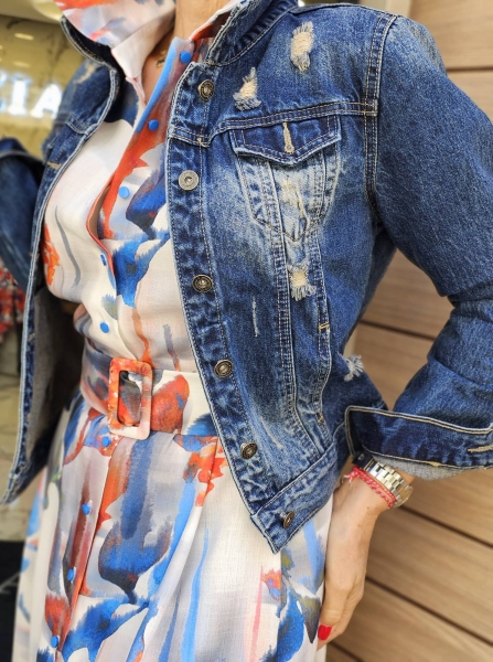 Яке от тъмен деним с изтъркани детайли. Моделът е втален и се закопчава с копчета. Размерът е универсален и е подходящ за S/M.