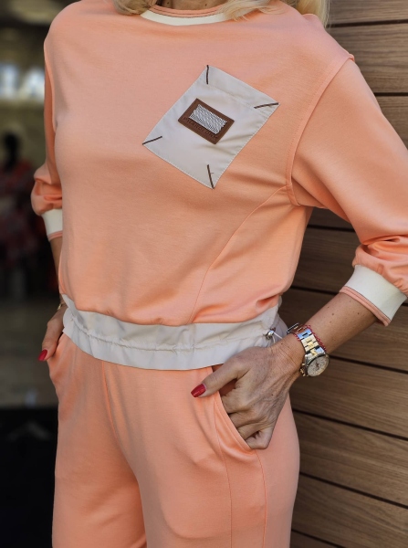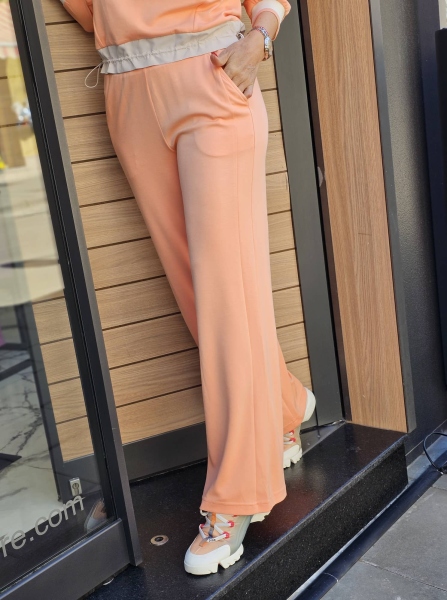 Ежедневен комплект от трико в цвят крем. Блузата е със 7/8 ръкав и завършва с ластик за вталяване. Панталонът е с широки крачоли и има ластик в талията.