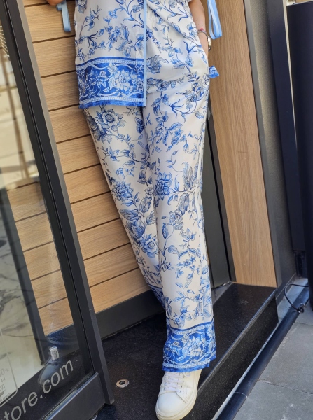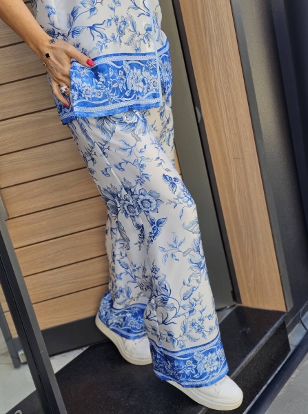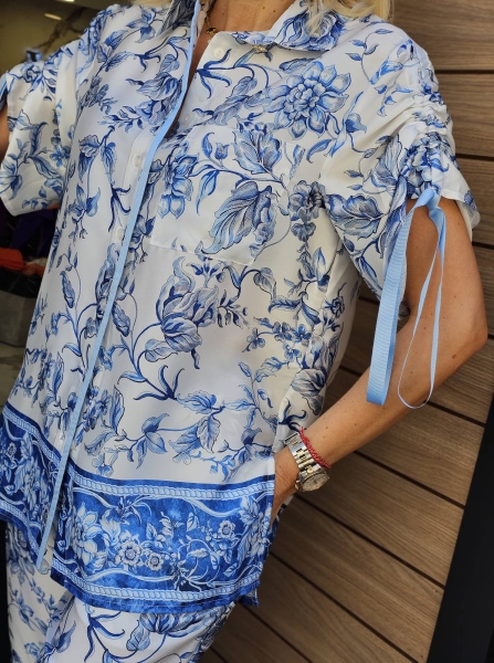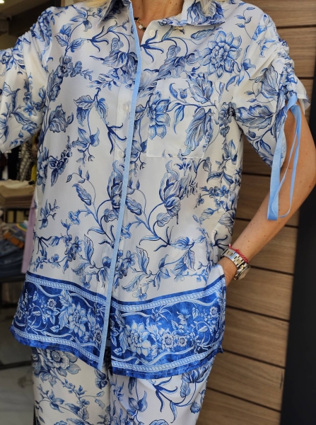 Комплект риза и панталон от сатенирана материя. Ризата е с къс ръкав и свободен силует. Панталонът е с широки крачоли и ластик на талията.