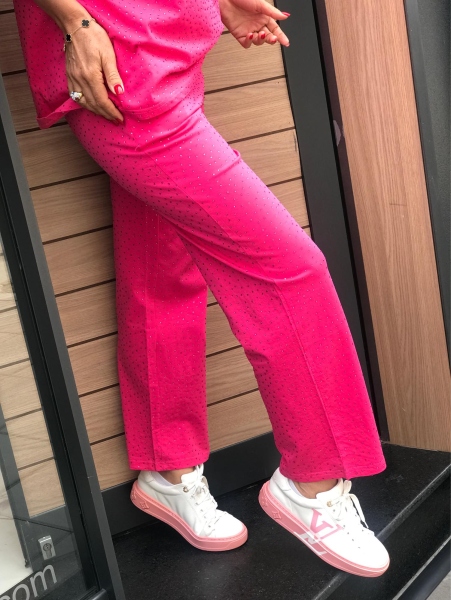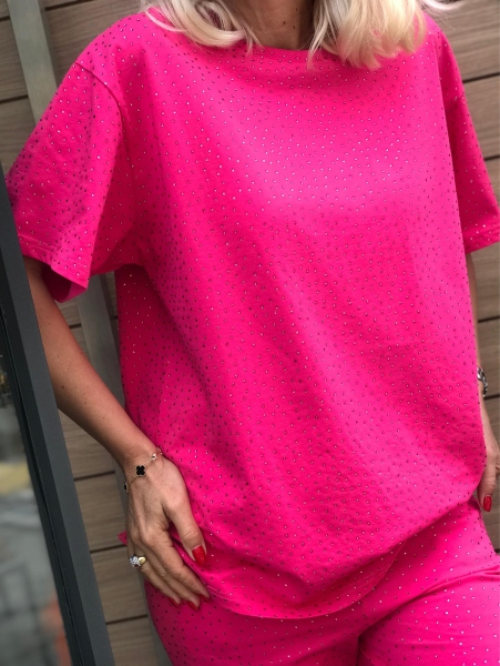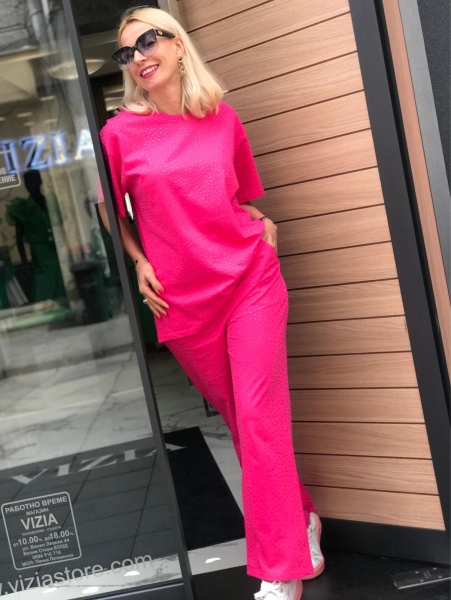 Комплект блуза с къс ръкав и панталон в цикламен цвят. Блузата е със свободен силует. Панталонът е със свободни крачоли и ластик на талията.