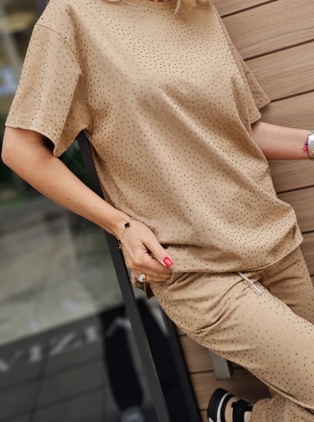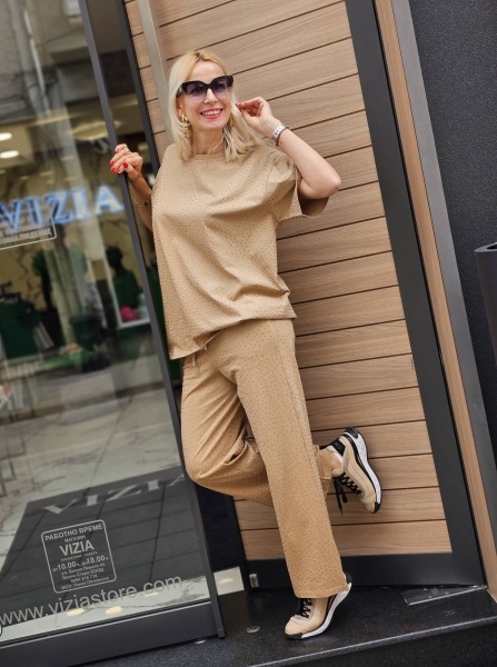 Комплект блуза с къс ръкав и панталон в цвят камел. Блузата е със свободен силует. Панталонът е със свободни крачоли и ластик на талията.