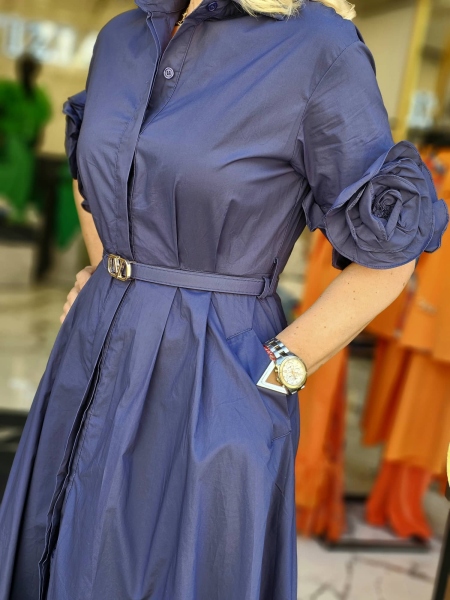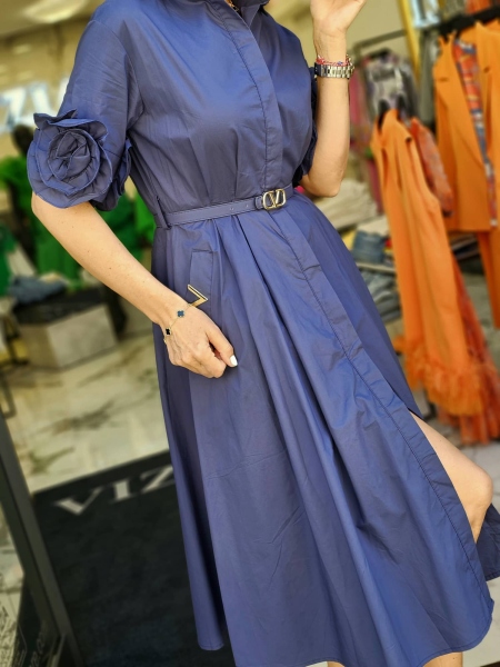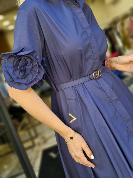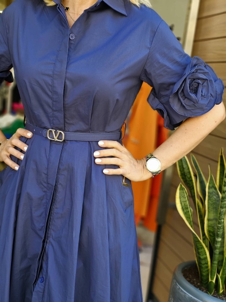Рокля тип риза от памучна материя в тъмно син цвят. Моделът е с къс ръкав, вталена горна част и свободна долна част.