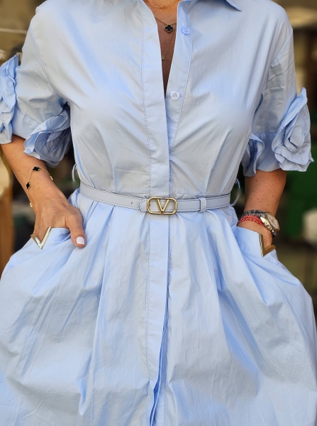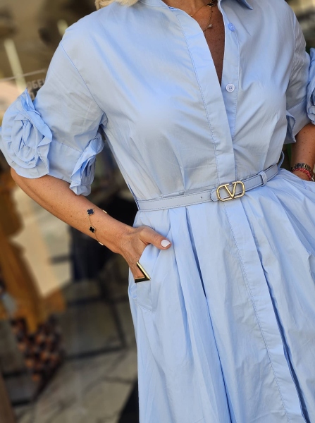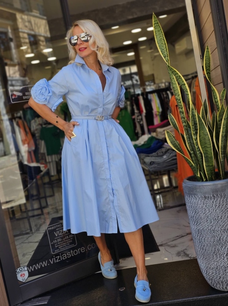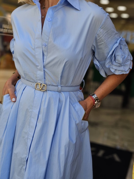 Рокля тип риза от памучна материя в светло син цвят. Моделът е с къс ръкав, вталена горна част и свободна долна част.