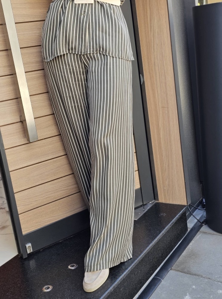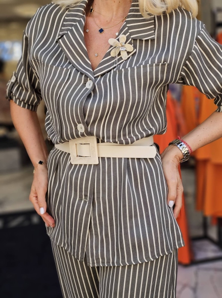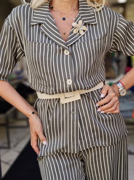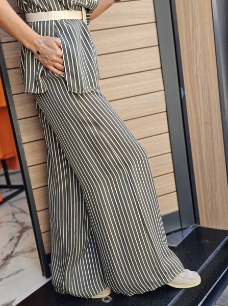 Комплект риза и панталон от тънка материя в зелено райе. Ризата е със свободен силует и издължена линия. Към нея има и колан, който може да се сложи на талията. Панталонът е с широки крачоли и се закопчава със страничен цип.