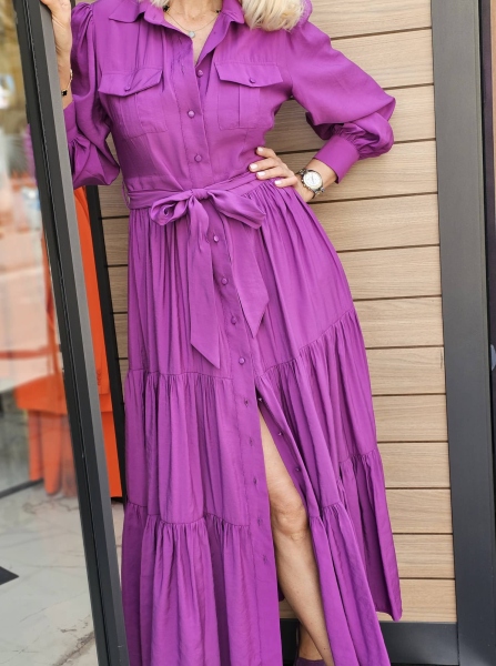 Дълга рокля тип риза в лилав цвят с изчистен дизайн. Моделът има шев на талията и се закопчава изцяло с копчета. Към нея има и текстилен колан.