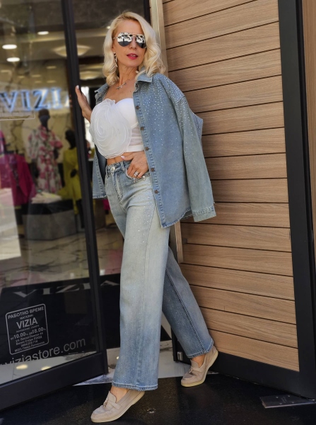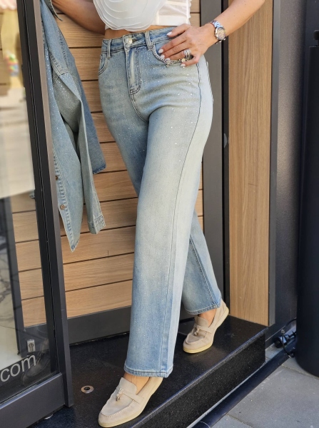 Дънки от светъл деним с декорация от камъни. Моделът е с виско талия и се закопчават с цип и копче. Крачолите са прави и широки.