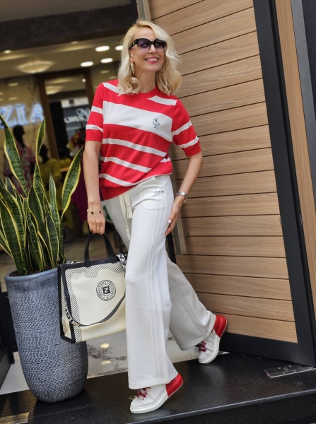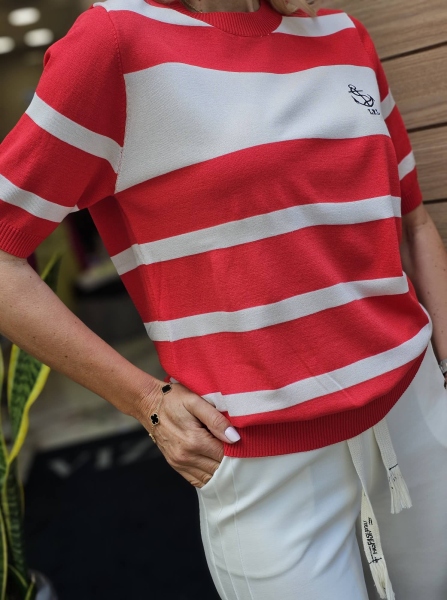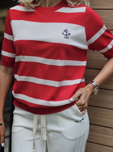 Блуза с къс ръкав от фино плетиво. Моделът е със свободен силует. Размерът е универсален и е подходящ за M, L.