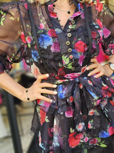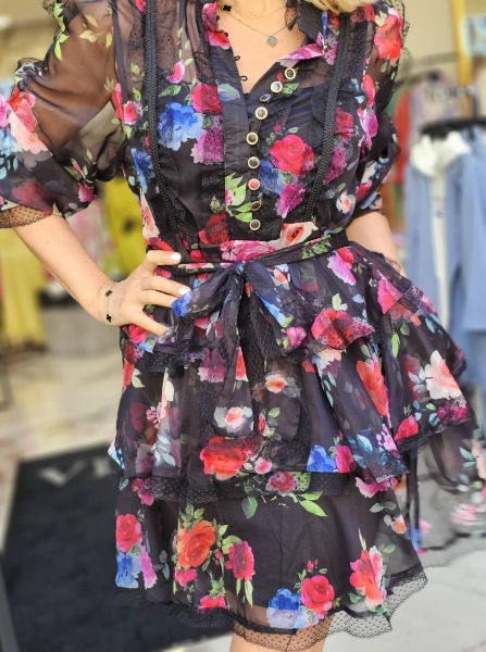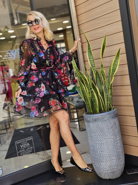 Къса рокля от фина материя в черен цвят с флорален десен. Моделът е с шев на талията и се закопчава с копчета. Към нея има и подвижна подплата.