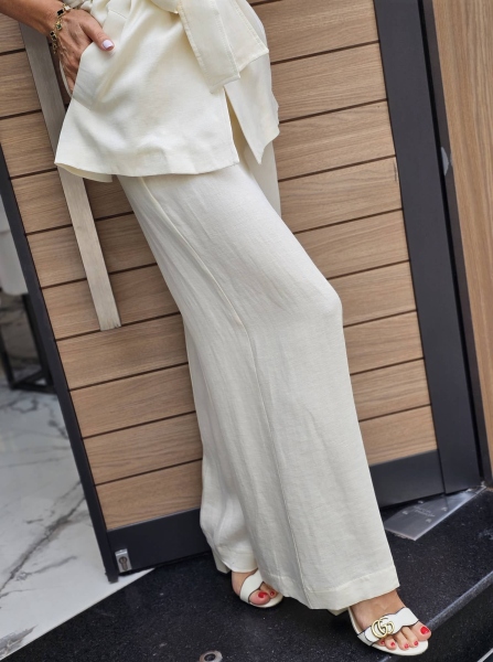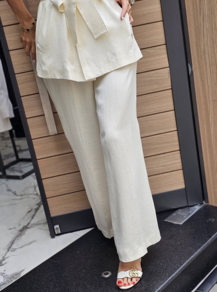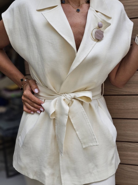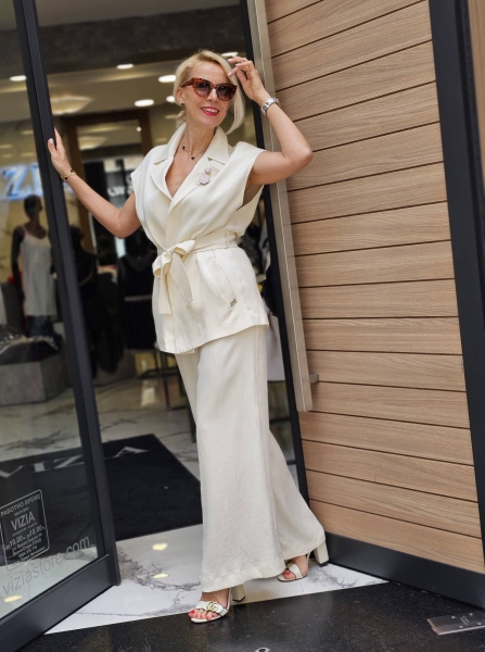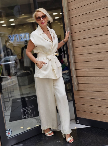 Комплект елек и панталон от мека материя. Елекът е с издължена линия има ревери и колан за вталяване. Панталонът е с широки крачоли. Към комплектът има аксесоар брошка.